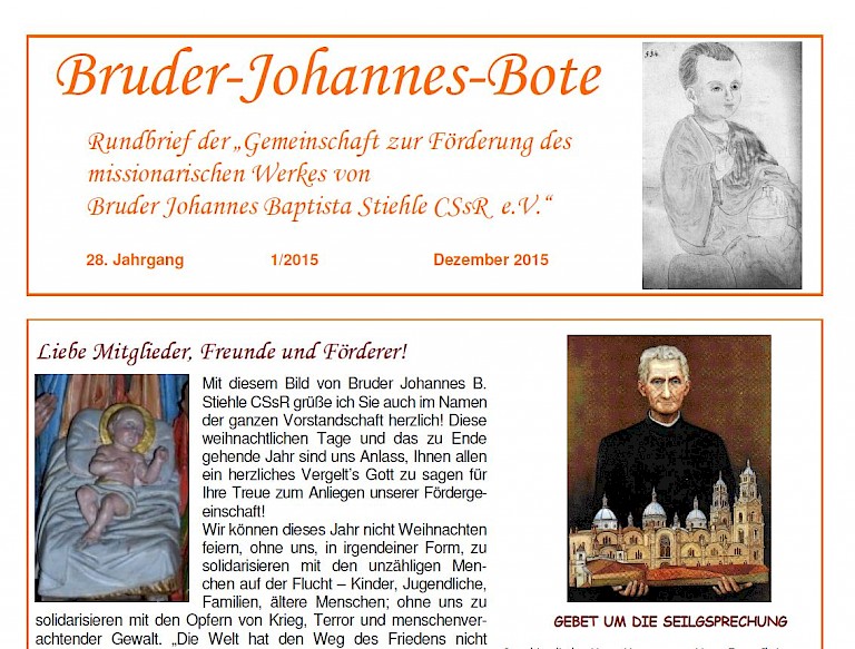 Rundbrief der Gemeinschaft zur Förderung des missionarischen Werkes von Bruder Johannes Baptista Stiehle CSsR e.V. im Dezember 2015.